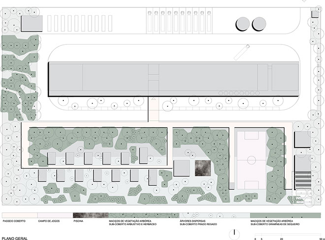 Do lado oposto encontram-se todas as áreas sociais e de recepção da unidade fabril. Assim foi criada um passeio coberto que se desenvolve paralelamente ao edifício, contendo e articulando os espaços plantados com vegetação regada e garantido uma ligação entre a entrada principal e todos os espaços sociais projectados – refeitório, dormitório Campo de Jogos, Clube, Piscina e habitações destinadas aos quadros superiores.
